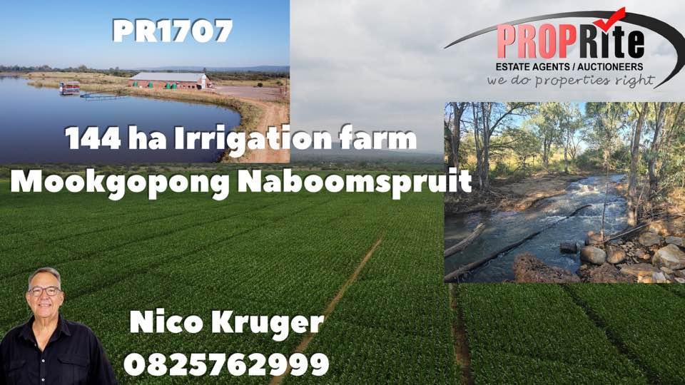 | Description: | Prime 144.66 ha Irrigation Farm for Sale – Naboomspruit Area Situated just 3 km from Naboomspruit, this outstanding property offers a rare opportunity to own a highly productive irrigation farm in a sought-after location. Key Features: 60 ha under Pivot Irrigation: Two well-maintained pivots covering 20 ha and 40 ha, supported by a fully equipped pump station. Water Security: Large, engineered irrigation dam spanning 14 ha when full, fed by a seasonal stream. One strong, equipped borehole ensures an additional supply. Game Fenced: The Entire property is enclosed with game fencing, providing added security and versatility. Excellent Infrastructure: Massive 1,200 m² shed with enclosed one-bedroom flat, office space, and tool room. Electrified fencing around the shed area. Diesel tank and two transformers included. Top-Quality Soil: Sandy soil is ideal for crop production, achieving maize yields of up to 17 tons/ha. Accommodation: Neat workers' compound with 6 rooms, a kitchen, and a bathroom. Additional Land Use: The Remaining portion of the farm features sweet bushveld grazing. Please note: There is no main residence on the property. This is a unique opportunity to acquire a highly productive, well-developed farm in a prime location. Serious, financially qualified buyers only. No additional loose assets available except pivots and pumps. 150 kva Generator to be negotiated.