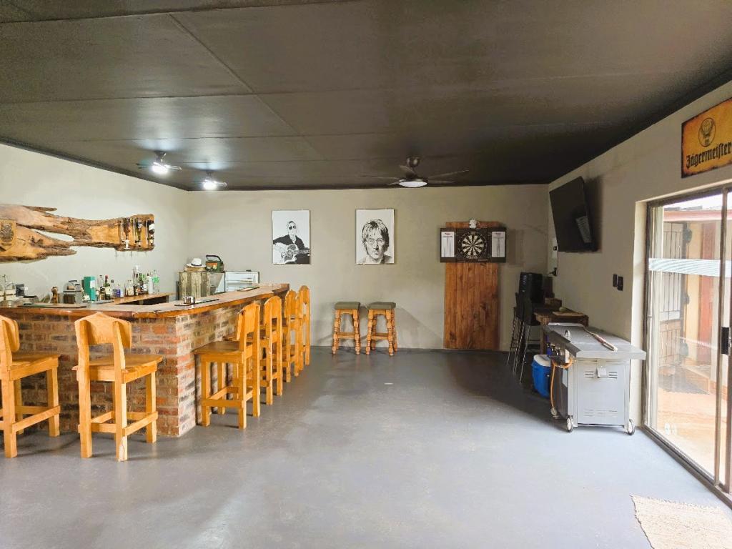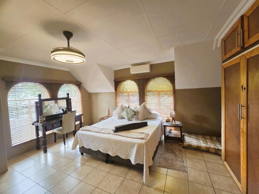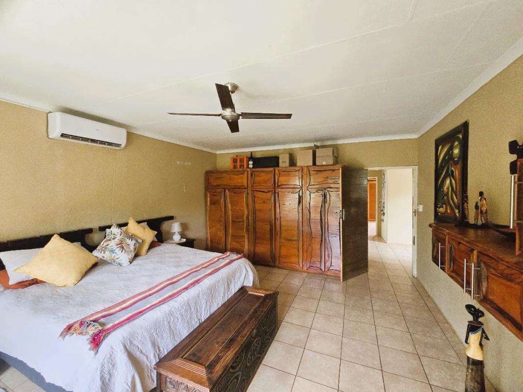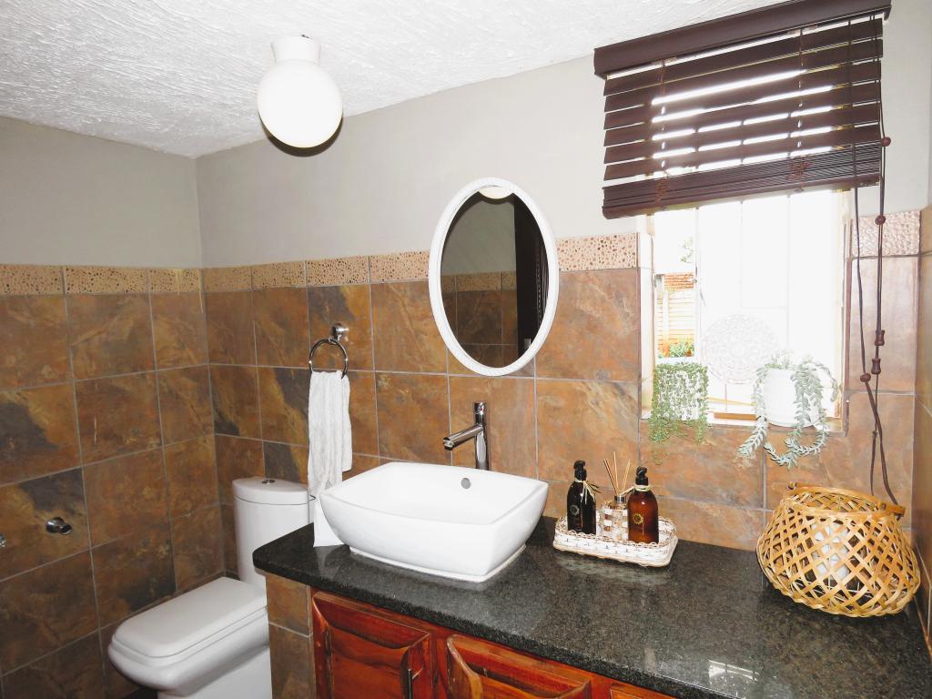 | Description: | Enjoy the spacious rooms, and even more spacious erf with tennis court and lovely garden. OUTSIDE FEATURES: Perimeter walls and palisade. Automated gate Low maintenance well established garden with beautiful fish pond & water feature Double garage and storeroom Entertainment room with build-in braai,basin and guest toilet Laundry Covered patio and braai area Garden flat with bedroom & bathroom, air conditioner, roof fan and build-in cupboards Outside zink Water tank with pressure pump (Bore hole not currently equipped) Tennis court